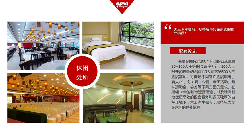 基地分擁有近200個床位的各式客房,30~300人不等的會議室7個,500人同時開餐的高規(guī)格餐廳以及可容納500人的拓展基地。可滿足不同客戶拓展訓(xùn)練、真人CS、冬(夏)令營、親子活動、趣味運動會、會務(wù)等不同方面的需求。