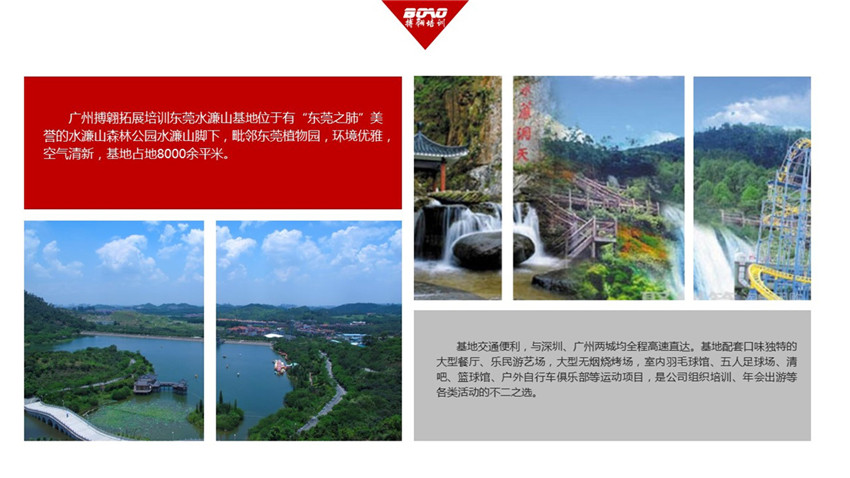 廣州搏翱拓展培訓(xùn)東莞水濂山基地位于有“東莞之肺”美譽(yù)的水濂山森林公園水濂山腳下,毗鄰東莞植物園,環(huán)境優(yōu)雅,空氣清新,基地占地8000余平米。基地交通便利,與深圳、廣州兩城均全程高速直達(dá)。