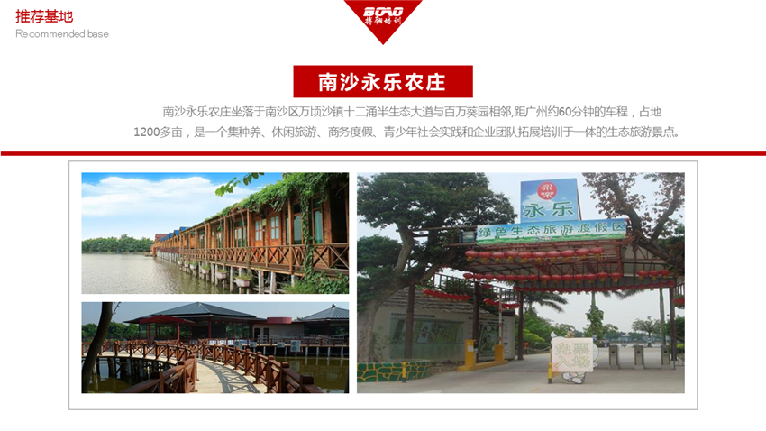 南沙永樂(lè)農(nóng)莊坐落于南沙區(qū)萬(wàn)頃沙鎮(zhèn)十二涌半生態(tài)大道與百萬(wàn)葵園相鄰,距廣州約60分鐘的車程,占地1200多畝,是一個(gè)集種養(yǎng)、休閑旅游、商務(wù)度假、青少年社會(huì)實(shí)踐和企業(yè)團(tuán)隊(duì)拓展培訓(xùn)于一體的生態(tài)旅游景點(diǎn);先后被評(píng)為廣州市青少年德育教育基地、廣州市青少年勞動(dòng)實(shí)踐基地,園內(nèi)設(shè)有延樂(lè)居餐廳、咖啡館、度假別墅區(qū)、植樹區(qū)、釣魚區(qū)、野炊區(qū)、燒烤區(qū)、智勇大沖關(guān)水上樂(lè)園、蕩秋千、人猿泰山、吊橋、網(wǎng)橋、蔬菜種植園、無(wú)公害水產(chǎn)養(yǎng)殖示范區(qū)、無(wú)公害種植示范區(qū)、高空拓展園、風(fēng)箏廣場(chǎng)、拔河區(qū)、竹筏競(jìng)技、同心板、野戰(zhàn)射擊場(chǎng)、休閑區(qū)、單車徑等;有可容納120人住宿的別墅、200人的會(huì)議中心、35人共一大圓桌用餐的豪華宴會(huì)廳,250人住宿的營(yíng)房、1000人露營(yíng)的帳篷及配套設(shè)備、1000人的野炊區(qū)、300人的燒烤區(qū)、500人同時(shí)用餐及品嘗特色沙田美食的餐廳、配有表演舞臺(tái)的室內(nèi)大廳和大廣場(chǎng)。