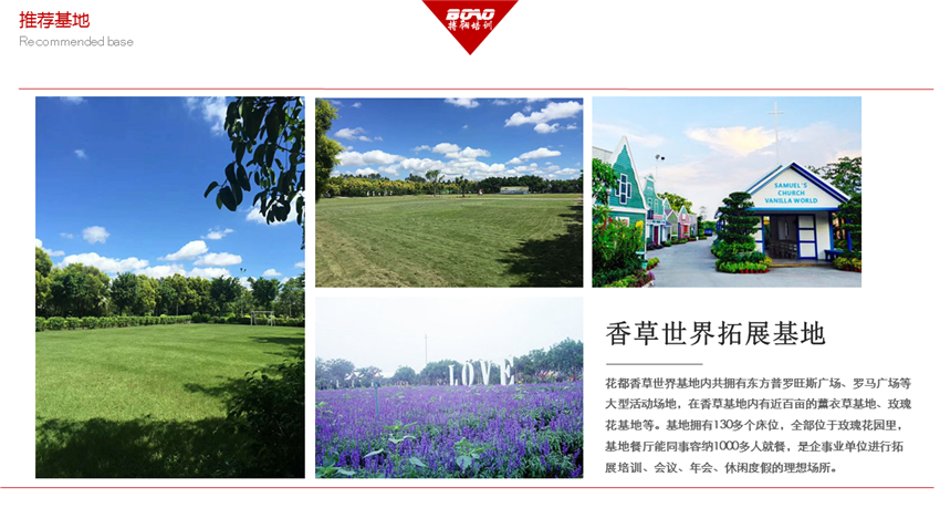 花都香草拓展訓(xùn)練基地位于花都香草世界內(nèi),廣東省內(nèi)唯一一家香草觀賞地,地處花都花山鎮(zhèn),廣州驅(qū)車只需35分鐘,距廣州花都國際機場8公里,至清遠(yuǎn)市中心38公里?;卣嫉?00畝,擁有A、B、C、D、E五個大草坪活動區(qū)域和水上活動區(qū)域,同時接待多個團(tuán)隊進(jìn)行體驗式拓展培訓(xùn),拓展項目多達(dá)幾十,全部由具有國際水平的教練執(zhí)教。