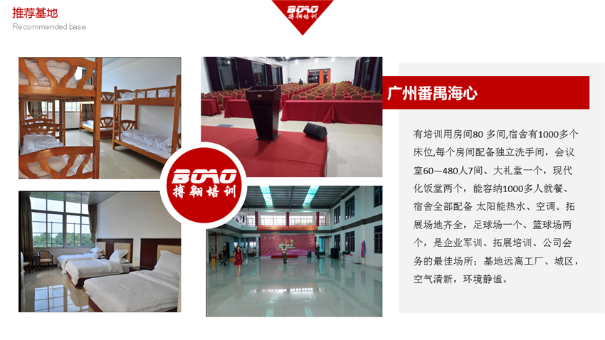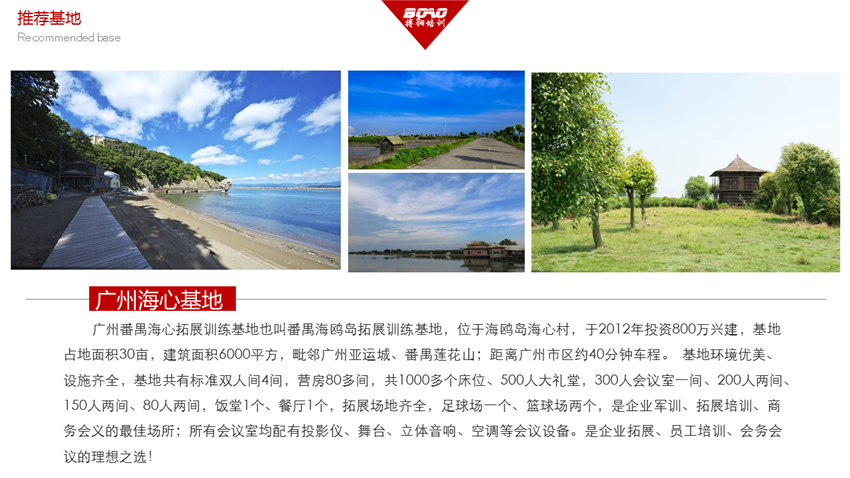 廣州番禺海心拓展訓練基地也叫番禺海鷗島拓展訓練基地,位于海鷗島海心村,于2012年投資800萬興建,基地占地面積30畝,建筑面積6000平方,毗鄰廣州亞運城、番禺蓮花山;距離廣州市區(qū)約40分鐘車程。 基地環(huán)境優(yōu)美、設(shè)施齊全,基地共有標準雙人間4間,營房80多間,共1000多個床位、500人大禮堂,300人會議室一間、200人兩間、150人兩間、80人兩間,飯?zhí)?個、餐廳1個,拓展場地齊全,足球場一個、籃球場兩個,是企業(yè)軍訓、拓展培訓、商務(wù)會義的最佳場所;所有會議室均配有投影儀、舞臺、立體音響、空調(diào)等會議設(shè)備。是企業(yè)拓展、員工培訓、會務(wù)會議的理想之選!