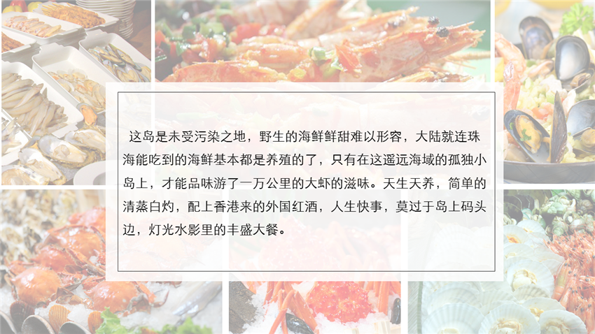 這島是未受污染之地,野生的海鮮鮮甜難以形容,大陸就連珠海能吃到的海鮮基本都是養(yǎng)殖的了,只有在這遙遠(yuǎn)海域的孤獨(dú)小島上,才能品味游了一萬(wàn)公里的大蝦的滋味。天生天養(yǎng),簡(jiǎn)單的清蒸白灼,配上香港來(lái)的外國(guó)紅酒,人生快事,莫過(guò)于島上碼頭邊,燈光水影里的豐盛大餐。
